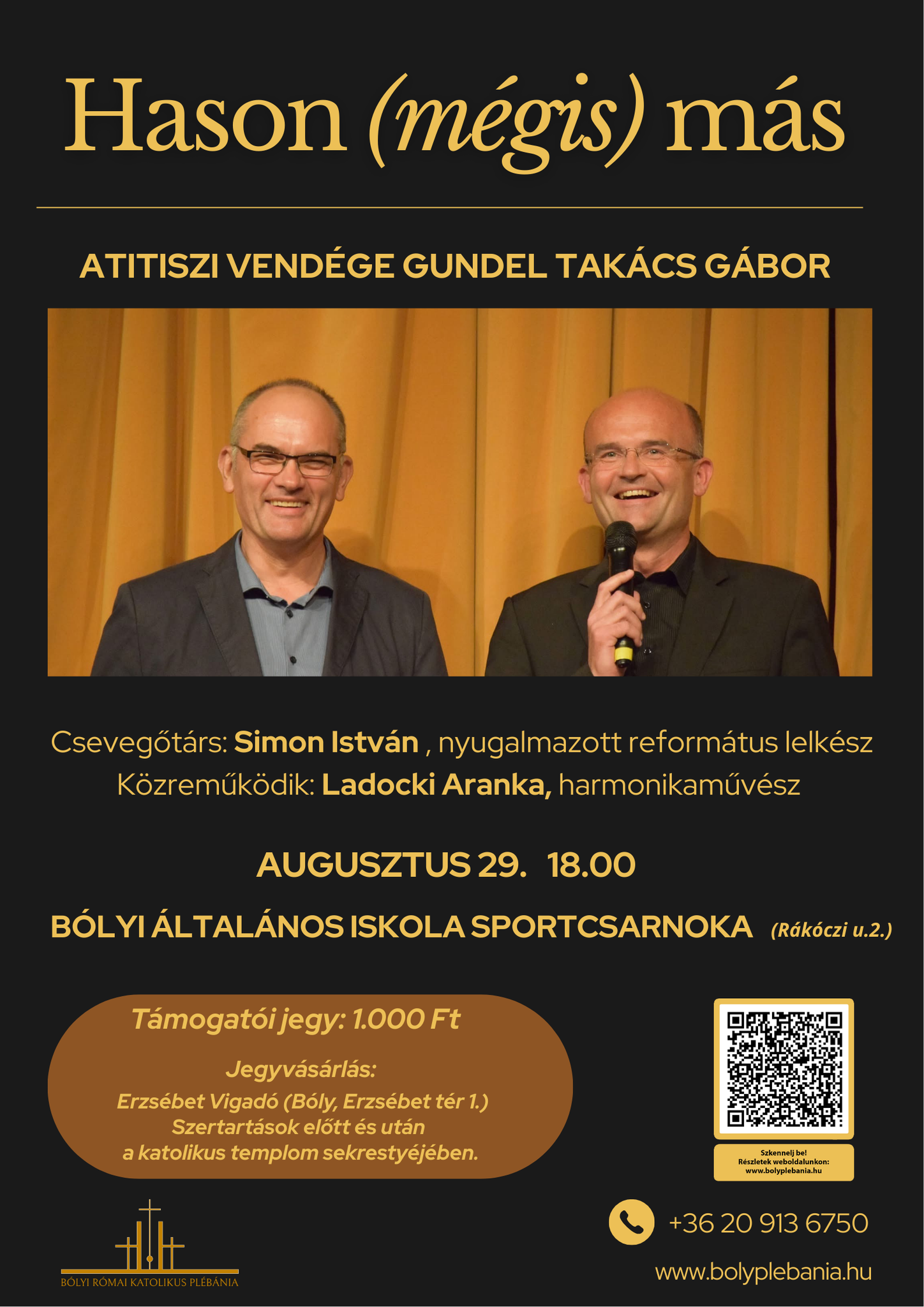 Atitiszi vendége Gundel Takács Gábor, az Általános Iskola Sportcsarnokában, a kötetlen beszélgetős estre szeretettel várja az érdeklődőket! Maximum 250 fő!