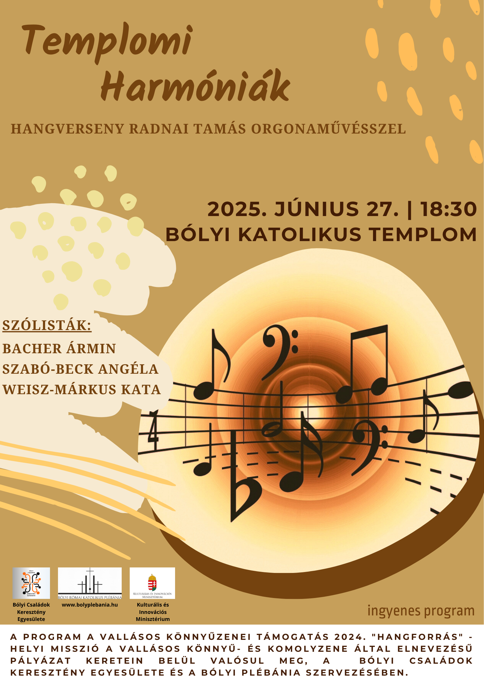 A program a vallásos könnyűzenei támogatás 2024. "hangforrás" - helyi misszió a vallásos könnyű- és komolyzene által elnevezésű pályázat keretein belül valósul meg, a bólyi családok keresztény egyesülete és a bólyi plébánia szervezésében.